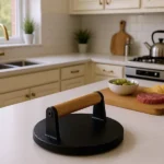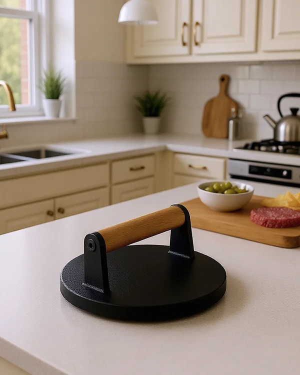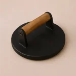 Krucible Kitchen’s 6-inch flat cast iron burger press pre-seasoned is engineered to deliver perfect searing and uniform thickness for burgers, sandwiches, steaks, and more. Its heavy construction ensures consistent weight pressure for quick, even cooking, reduced shrinkage, and better crust formation.