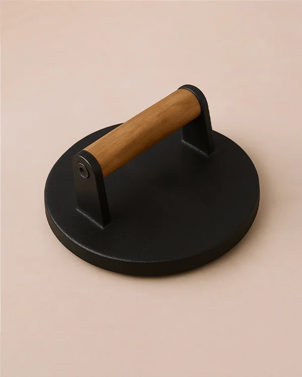 This flat press helps remove excess grease while enhancing flavour with a professional sear. The smooth matte black finish and solid cast design offer premium durability and timeless style.