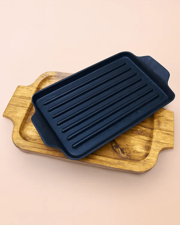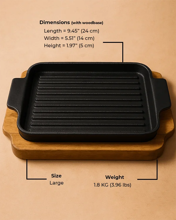 Cast Iron Sizzler Plate – 10 inch Round – Matte Black Finish with Wooden Base & Dual Side Grips