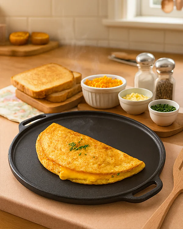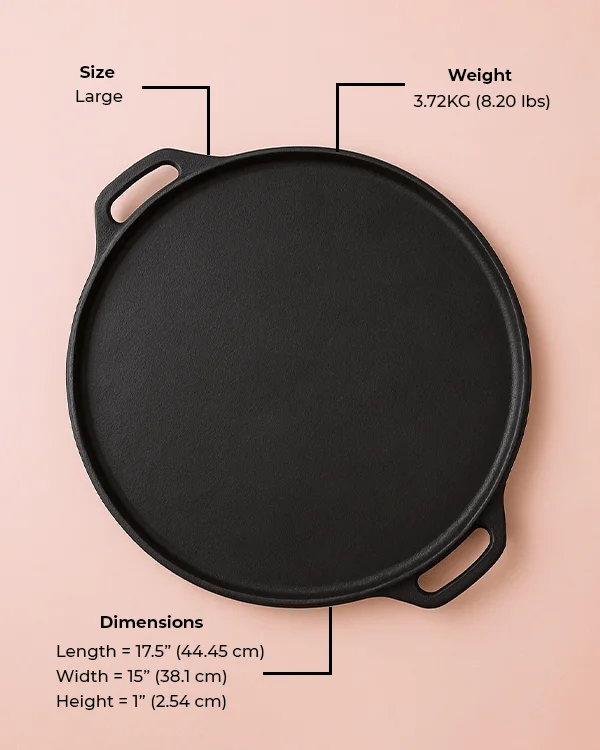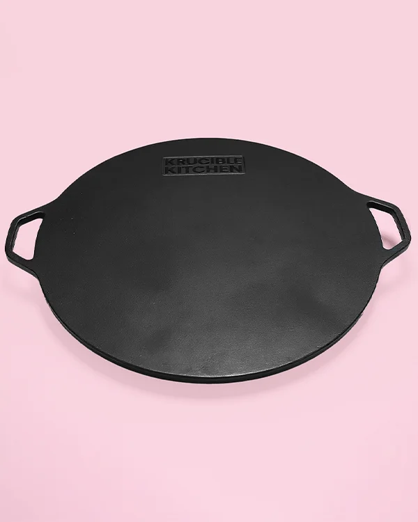 Krucible Kitchen’s 15-inch seasoned cast iron tawa with dual handles pre-seasoned is designed for traditional and modern kitchens alike. With its spacious flat surface, it is perfect for preparing large rotis, dosas, crepes, pancakes, and other flatbreads. The dual handles ensure easy handling and safe grip while transferring the tawa from the stove to the table.