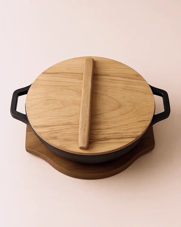 Cast Iron (Chemical-Free, Pre-Seasoned), Wood (Base & Lid)