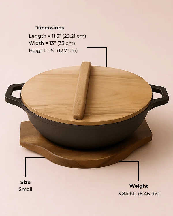 Krucible Kitchen’s 9-inch cast iron wok with wooden lid pre-seasoned and serving base is a versatile and compact cookware piece, designed for small portion meals and convenient table presentation. The included wooden lid retains heat and moisture, while the wooden base allows you to serve hot dishes directly without damaging surfaces.