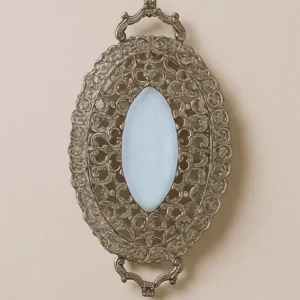 - A small, intricately designed leaf accent rests gently on the rim, adding a delicate, nature-inspired touch to the piece.